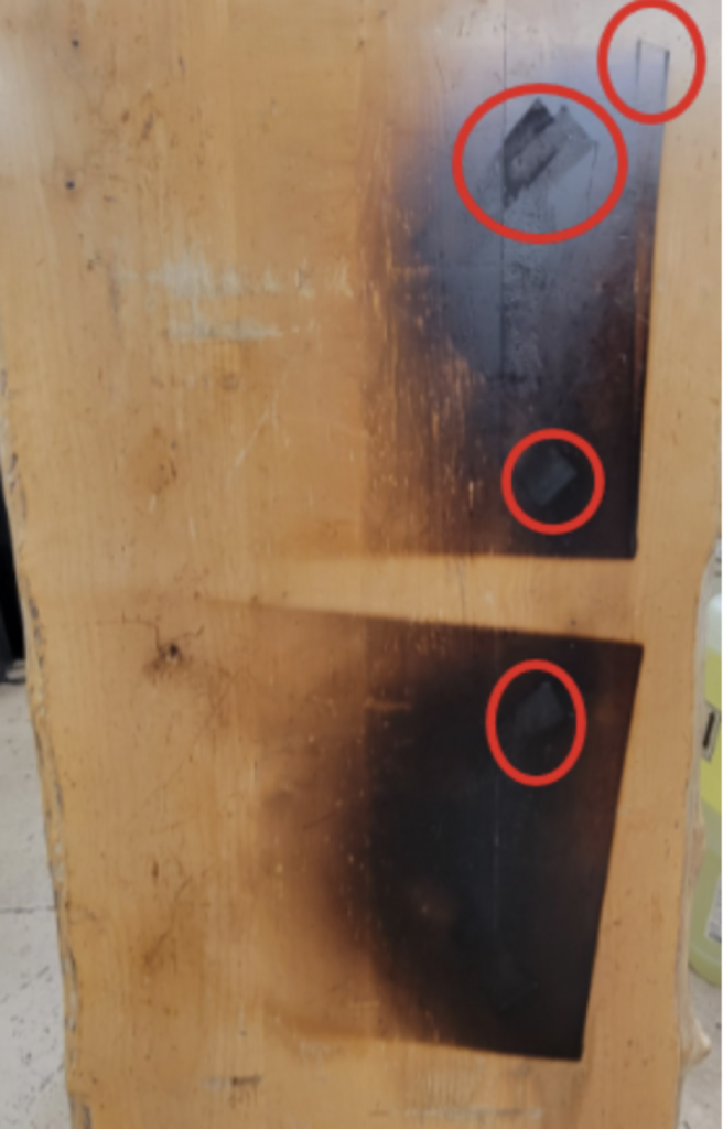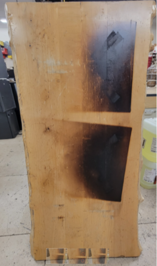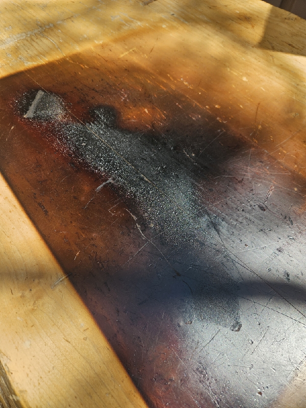Sanded table to remove burn marks, melted finish, chips and dents. Removed 95% of burn mark but burn went too deep into the wood and was not just the top layer. Table would have to be taken apart. The only other option is to put a darker stain to blend the rest of it out.