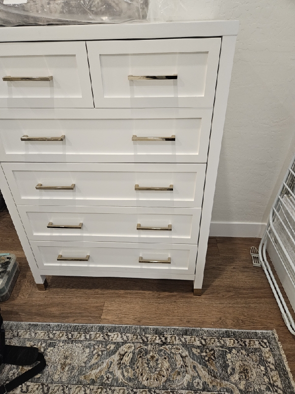 | Adjusted and aligned drawer on table. A pocket screw was used to reattach the bottom of the drawer opening to the side of the frame. screw was then covered over with matching color filler. Leveled drawer. Issue resolved. Filled and touched up leg on dresser. Issues resolved, job complete. |