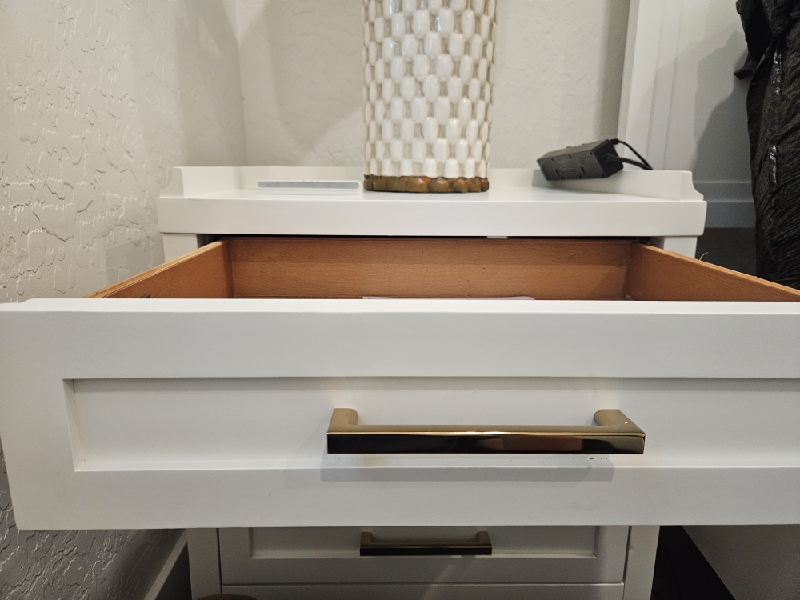 | ADJUST AND ALIGN DRAWER ON BEDSIDE TABLE, IT IS FALLING DOWN AND LOOKS LIKE THERE IS A PIECE STICKING OUT. FILL AND TOUCH UP DAMAGE TO LOWER LEG ON CHEST. |