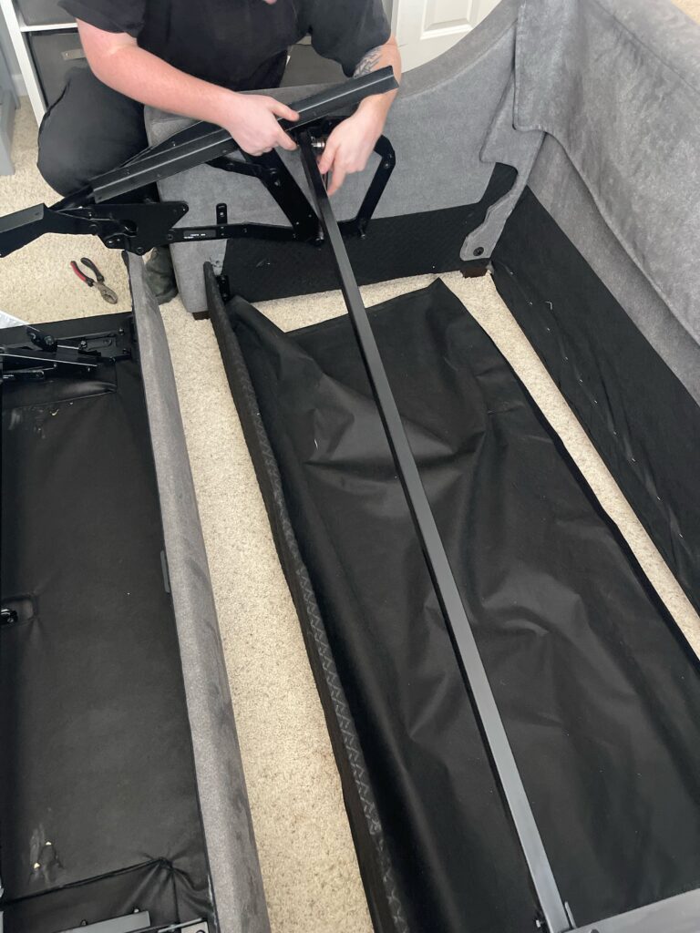 REPLACE LEFT AND RIGHT HINGE MECHANISMS ON SOFA. PART AT LOCATION. TWO PERSON REPAIR.