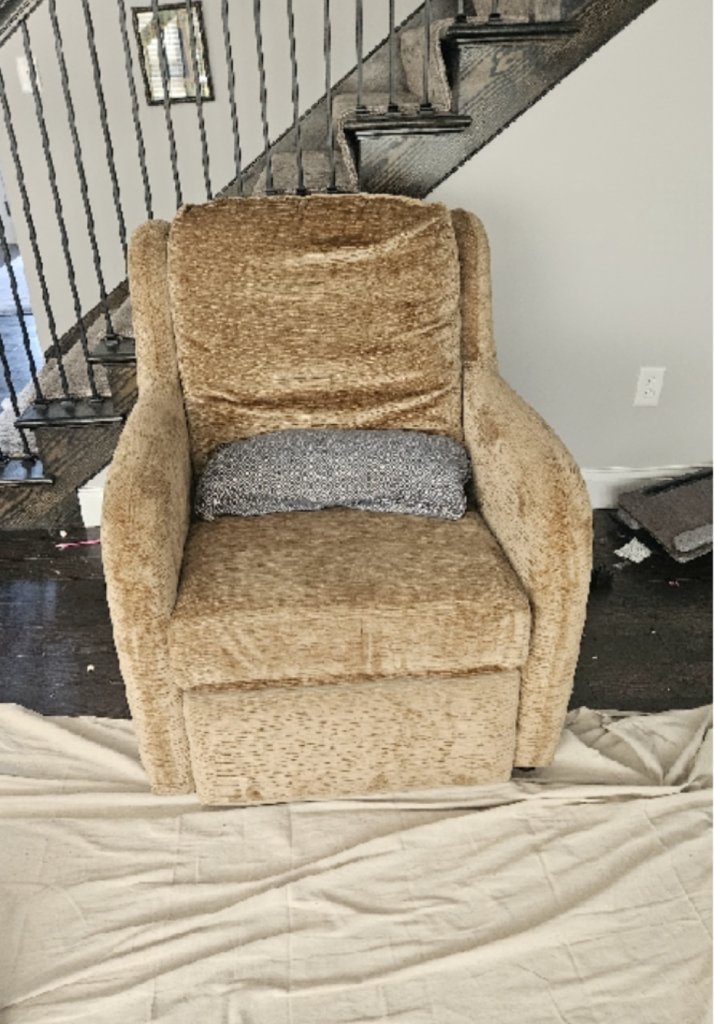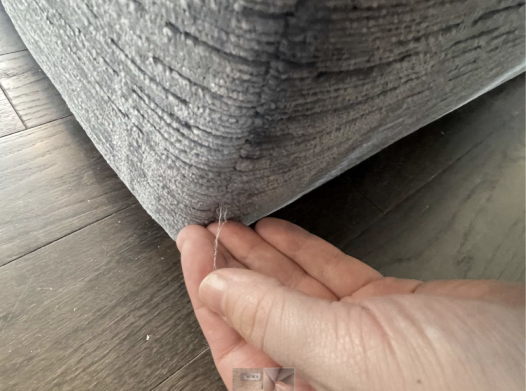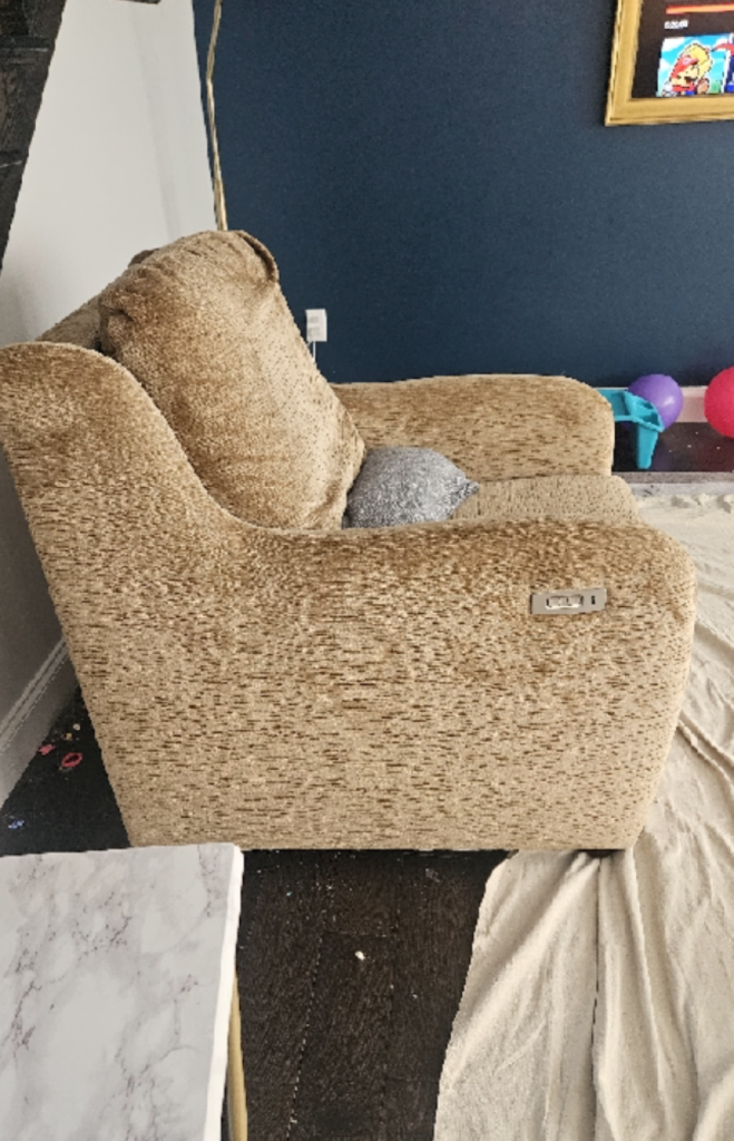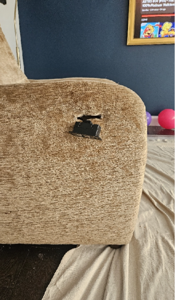 INSTALL POWER SWITCH ON RECLINER. SNIP LOOSE THREADS. PART AT LOCATION.