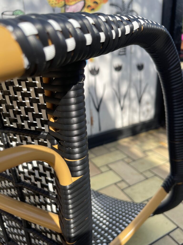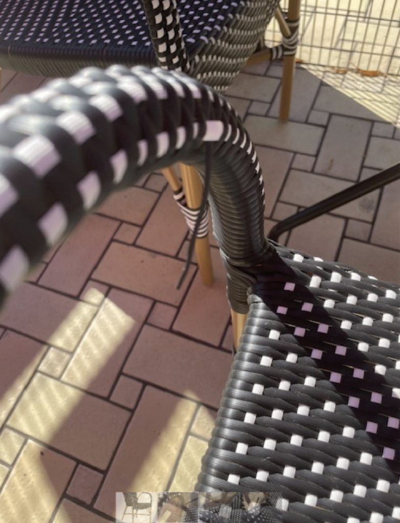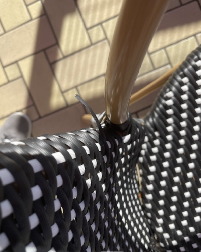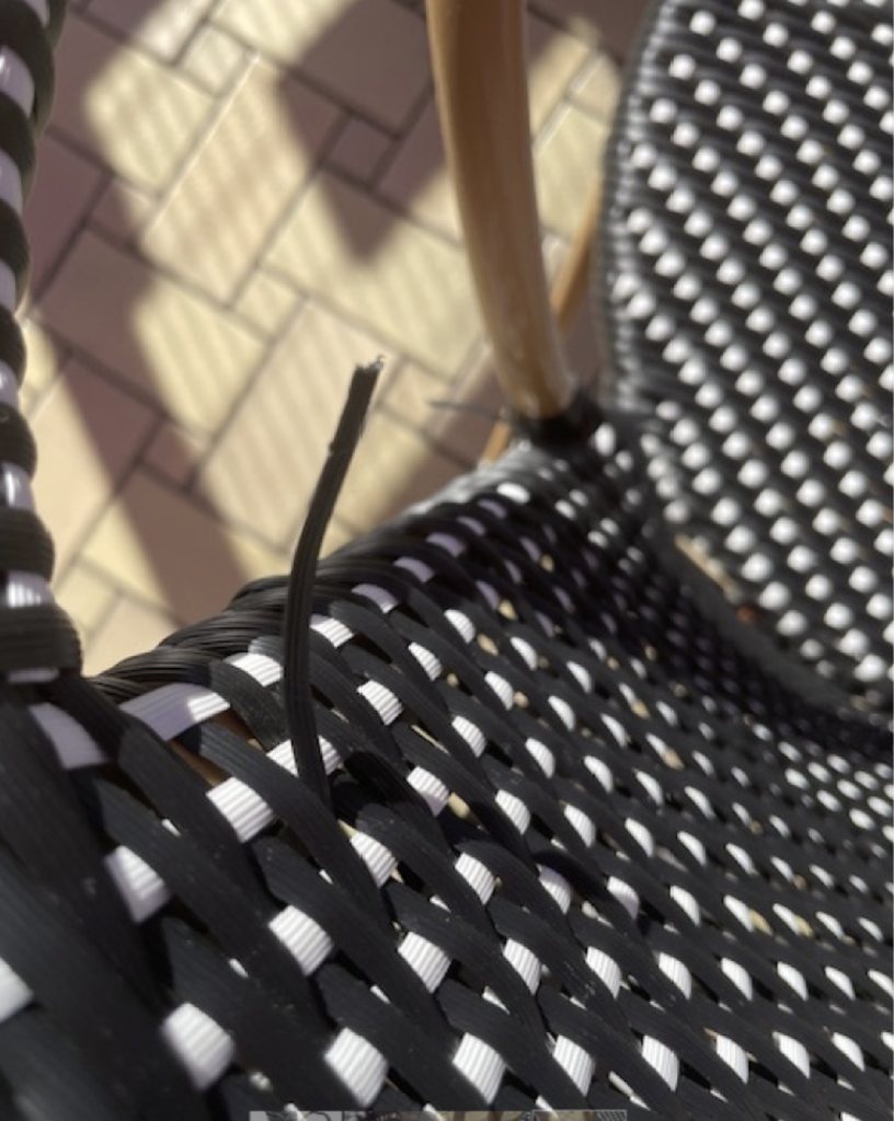Reattached and secured weave on chairs. Tucked loose weave back into correct placement and secured. Issues resolved, job complete.