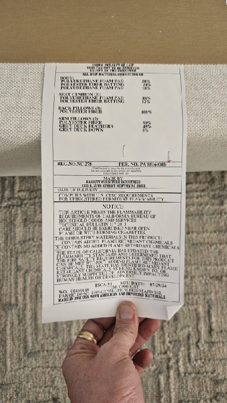 | PICK UP AND REPLACE OUTSIDE BACK PANEL ON SOFA. NEW PANEL AT BASSETT WAREHOUSE. CORRECT OUTSIDE BACK PANELS ON 2 SWIVEL CHAIRS, OUTSIDE IS PUSHED IN. STEAM AND TIGHTEN TO REMOVE DENTS. USE A THIN COTTON MATERIAL BETWEEN STEAMER AND FABRIC |