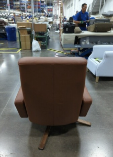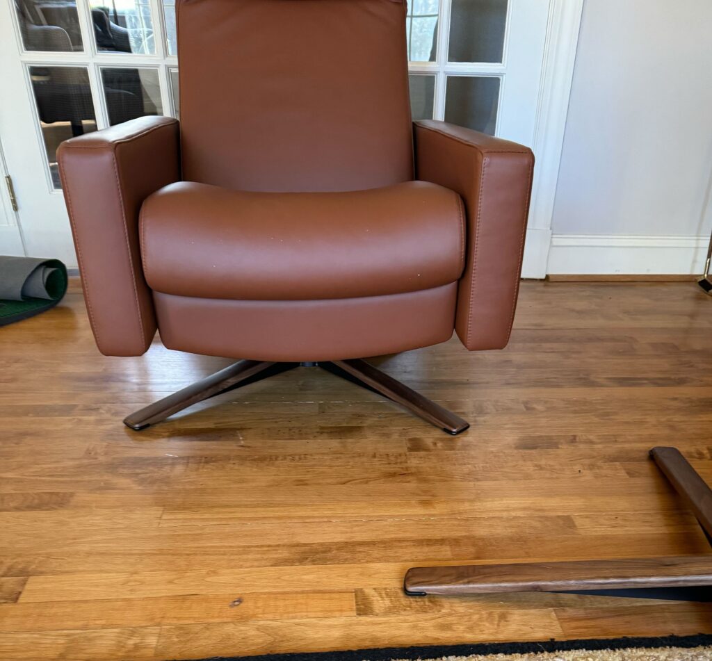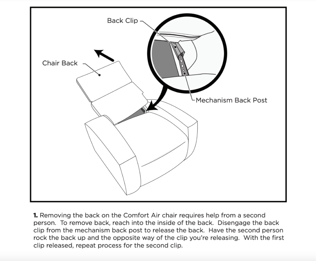 REPLACE BASE ON RECLINER. PART AT LOCATION. MAKE SURE ARMS ARE NOT TOUCHING THE BACK WHEN IT RECLINES. ALIGN WHERE NEEDED.