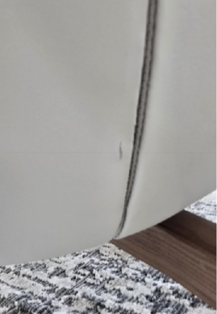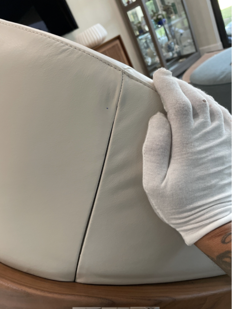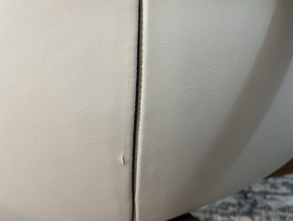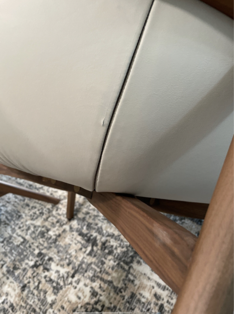 | CORRECT MISSING THREAD ON CHAIR. USE A HIDDEN STITCH, MAKE SURE THREAD DOES NOT SHOW. INSPECT CUT IN MATERIAL. ADVISE IF PARTS ARE NEEDED. |