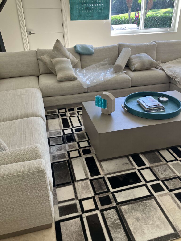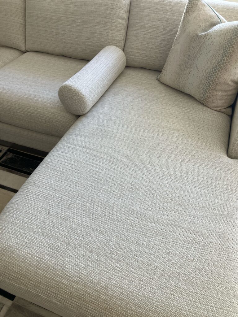 Pick up and install casing on sectional. Fluff and align cushions and seams. Part at Robb & Stucky store in Boca Raton.