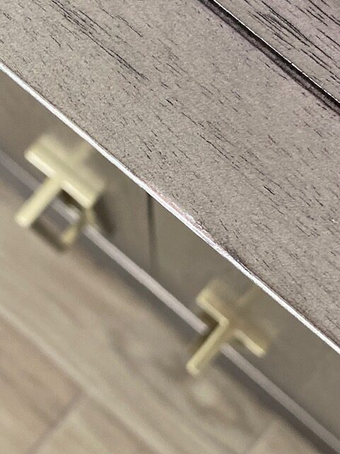 Fill and touch up missing finish on doors of cabinet. Color match – test hidden area first.
