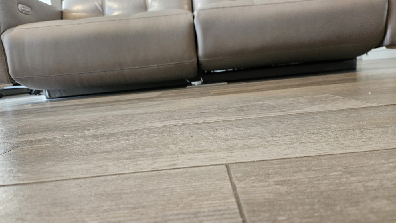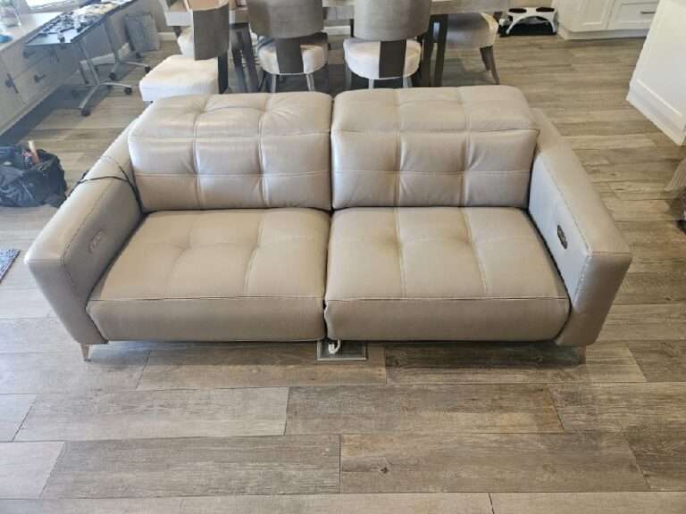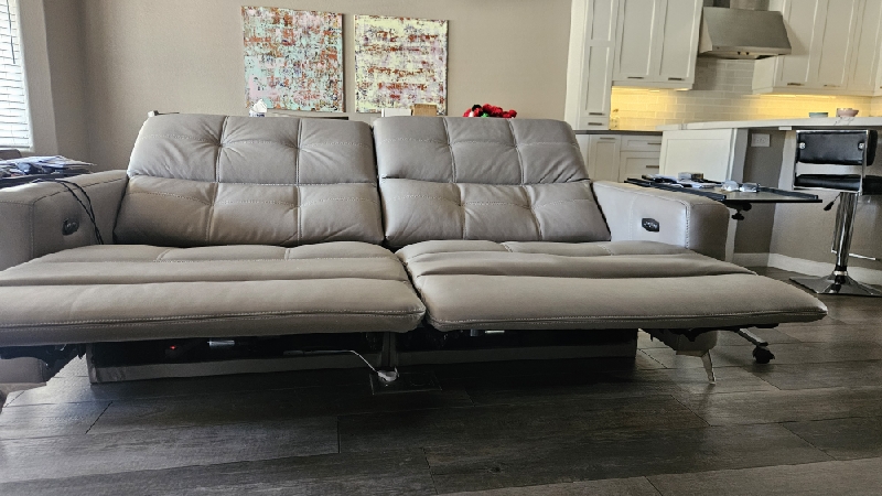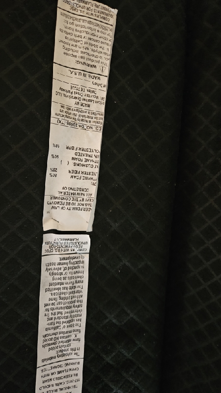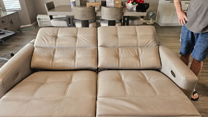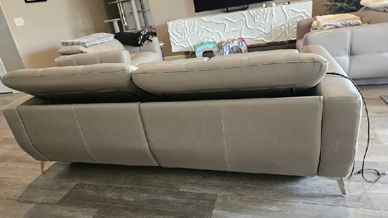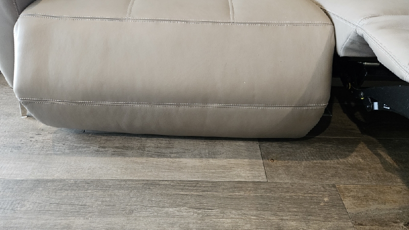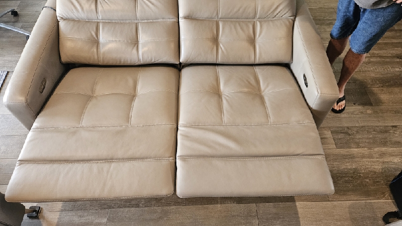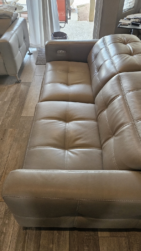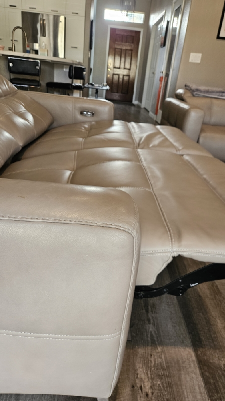 Inspect back and seat cushions. Right leg is raised higher. Advise in notes if parts are needed.